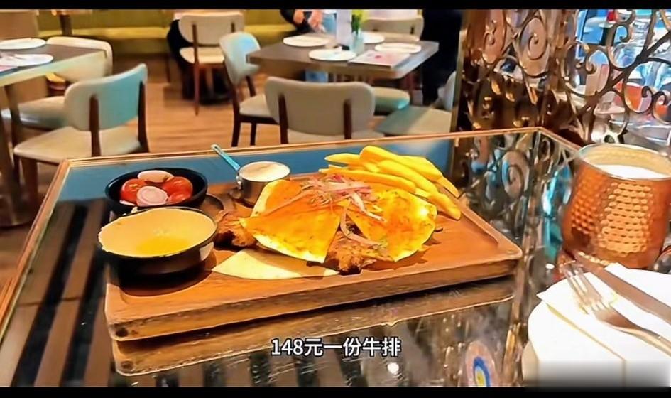看了一会他也有些饿了,于是他找了半天的饭店,也没有找到他想要吃的印度菜,于是他就开始吐槽,上海这么大个城市都找不到印度菜,看来上海也没有那么发达,没有办法的话,只能随便进了一个家餐厅,花了148点了一份牛排套餐。