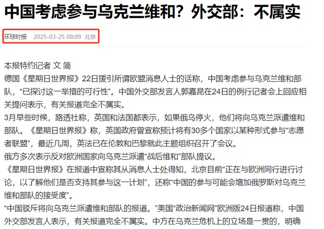 信源:环球时报 2025年3月25日 关于“中国考虑参与乌克兰维和?外交部:不属实”的报道
