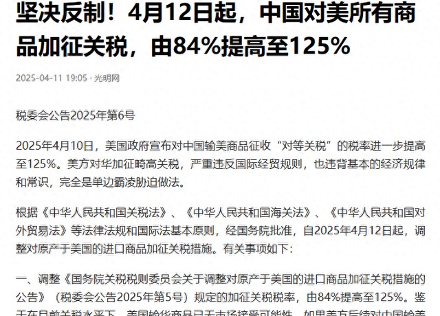 光明网:坚决反制!4月12日起,中国对美所有商品加征关税,由84%提高至125%