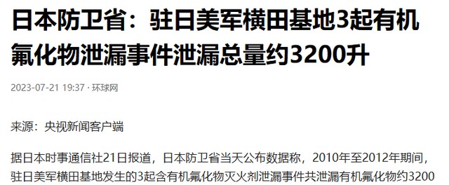 环球网:日本防卫省:驻日美军横田基地3起有机氟化物泄漏事件泄漏总量约3200升
