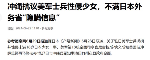 无论媒曝光的1995年的12岁冲绳少女被驻美基地的3名士兵暴力迫害,还是2023年10月16岁的冲绳女生被驻地的美国士兵暴力迫害。