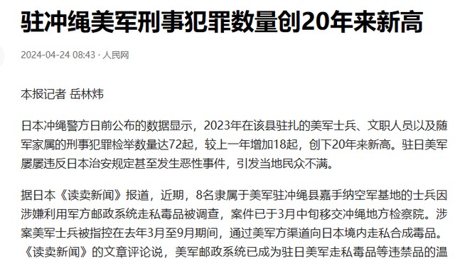 人民网:驻冲绳美军刑事犯罪数量创20年来新高