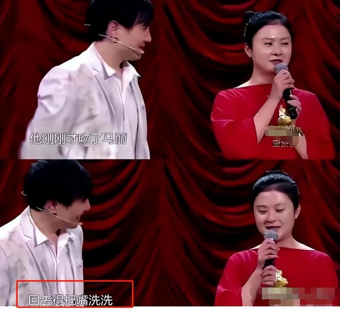 演出结束后,主持人将坐在后台的沈腾女友王琦请了上来。这时马丽便起哄,让沈腾亲一下王琦,结果王琦却脱口而出:“刚刚亲了马丽,回去把嘴洗洗,再亲。”