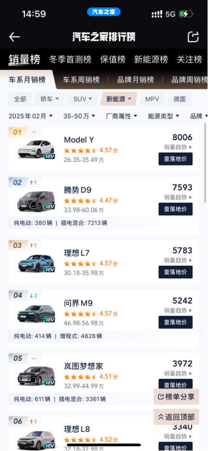 2025 年 2 月销量榜单透露关键信号:腾势 D9 以 7593 辆位列新能源榜次席,成为高端 MPV 市场 “破局者”。在 30 万 + 新能源 MPV 领域,其销量占比突出,不仅改写了传统燃油 MPV 主导的市场格局,更证明新能源车型在高端商务、家庭场景的适配性。