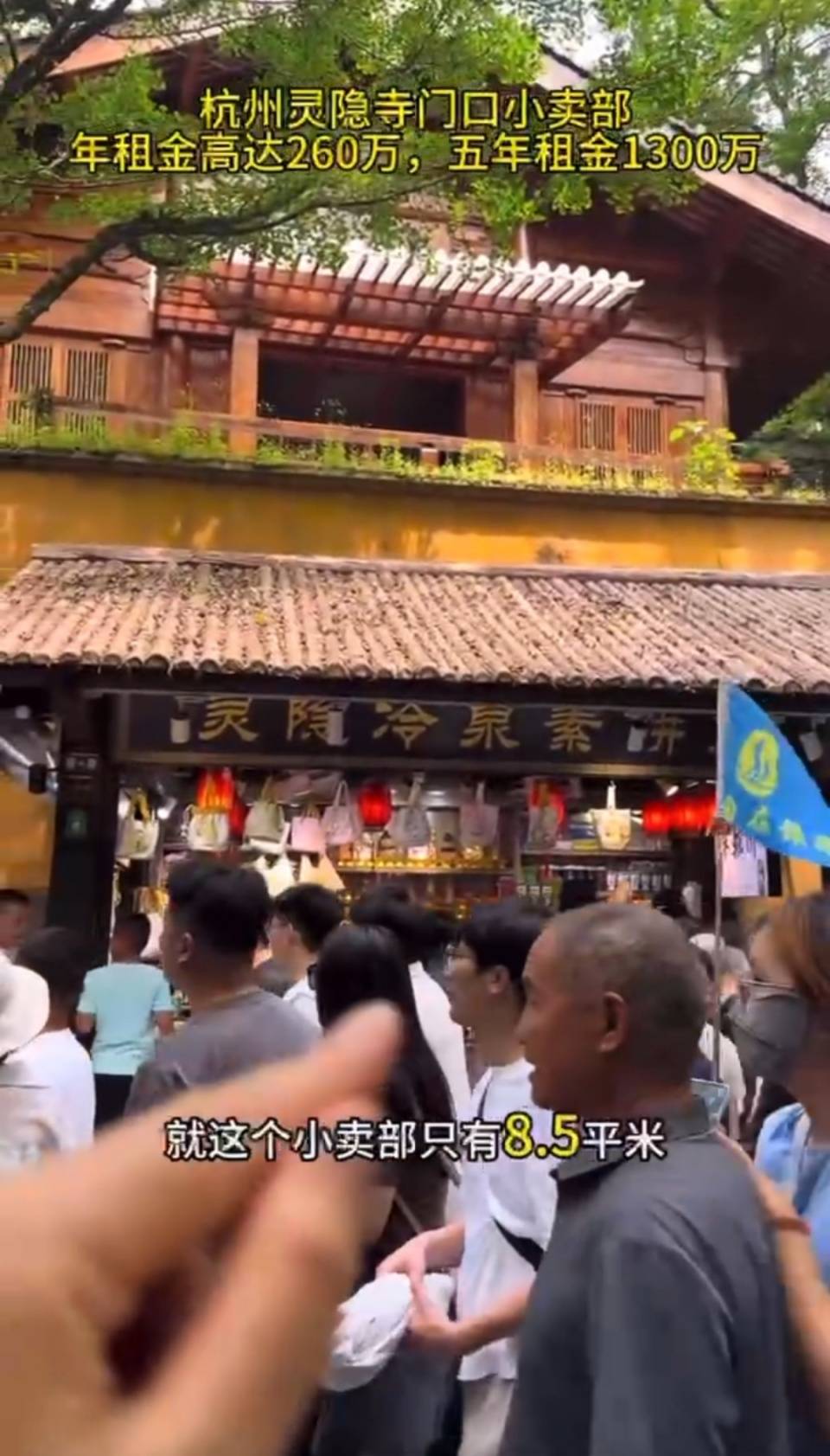 该小卖部名为“灵隐冷泉素饼店”,位于灵隐寺售票处入口旁,是游客进入景区的必经之路,日均人流量数万人次,节假日可达8万以上,在2022年6月,该店铺租赁权通过公开竞标,起拍价111.8万元,经历103轮竞价后以260.3万元成交,溢价率225%。另一处4.5平方米的小店年租金甚至达284万元。