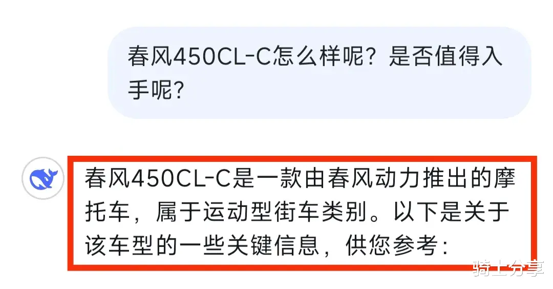 那么问题来了,春风450CL-C怎么样呢?是否值得入手呢?我们来听听现在比较流行的Deep Seek 怎么说?
