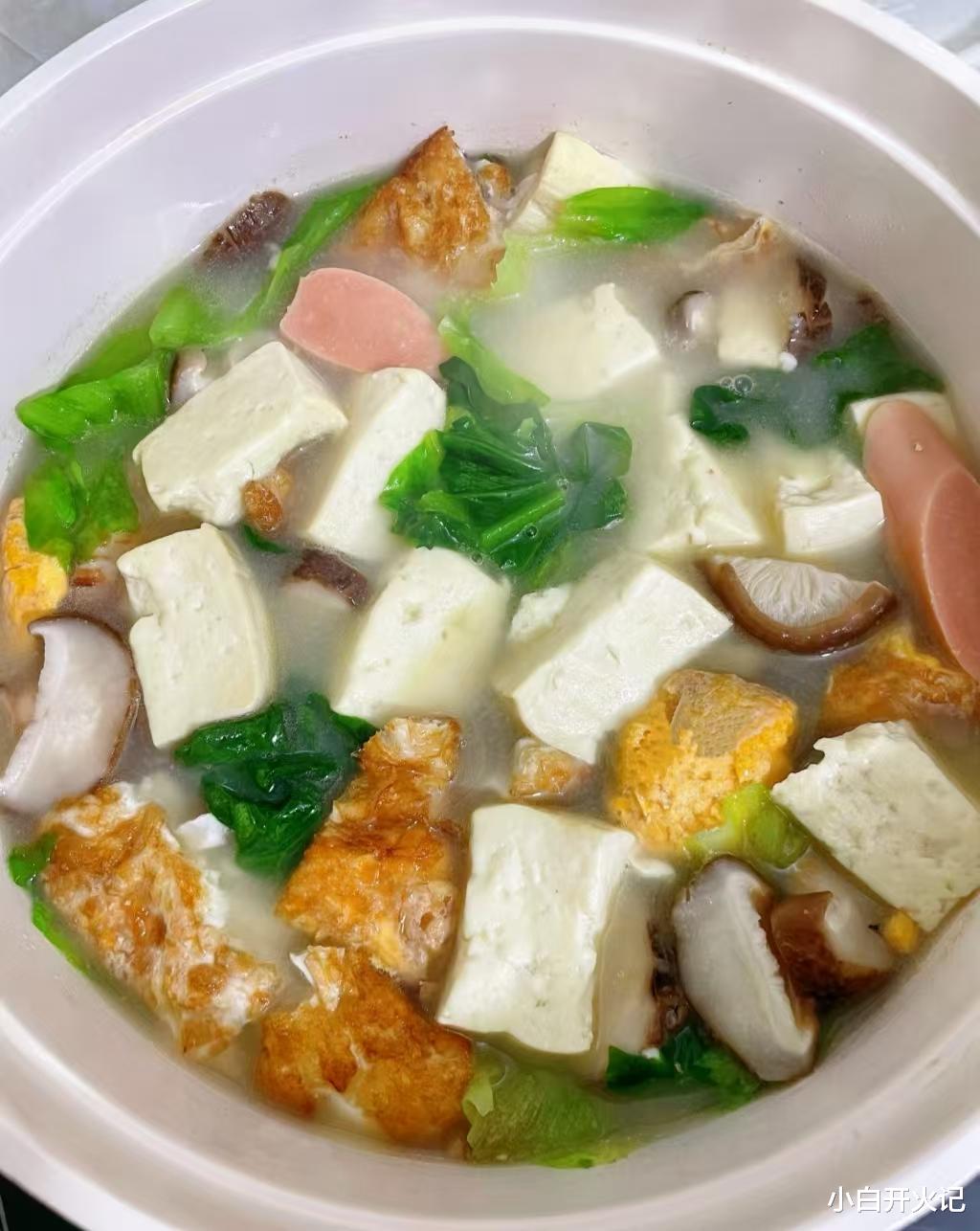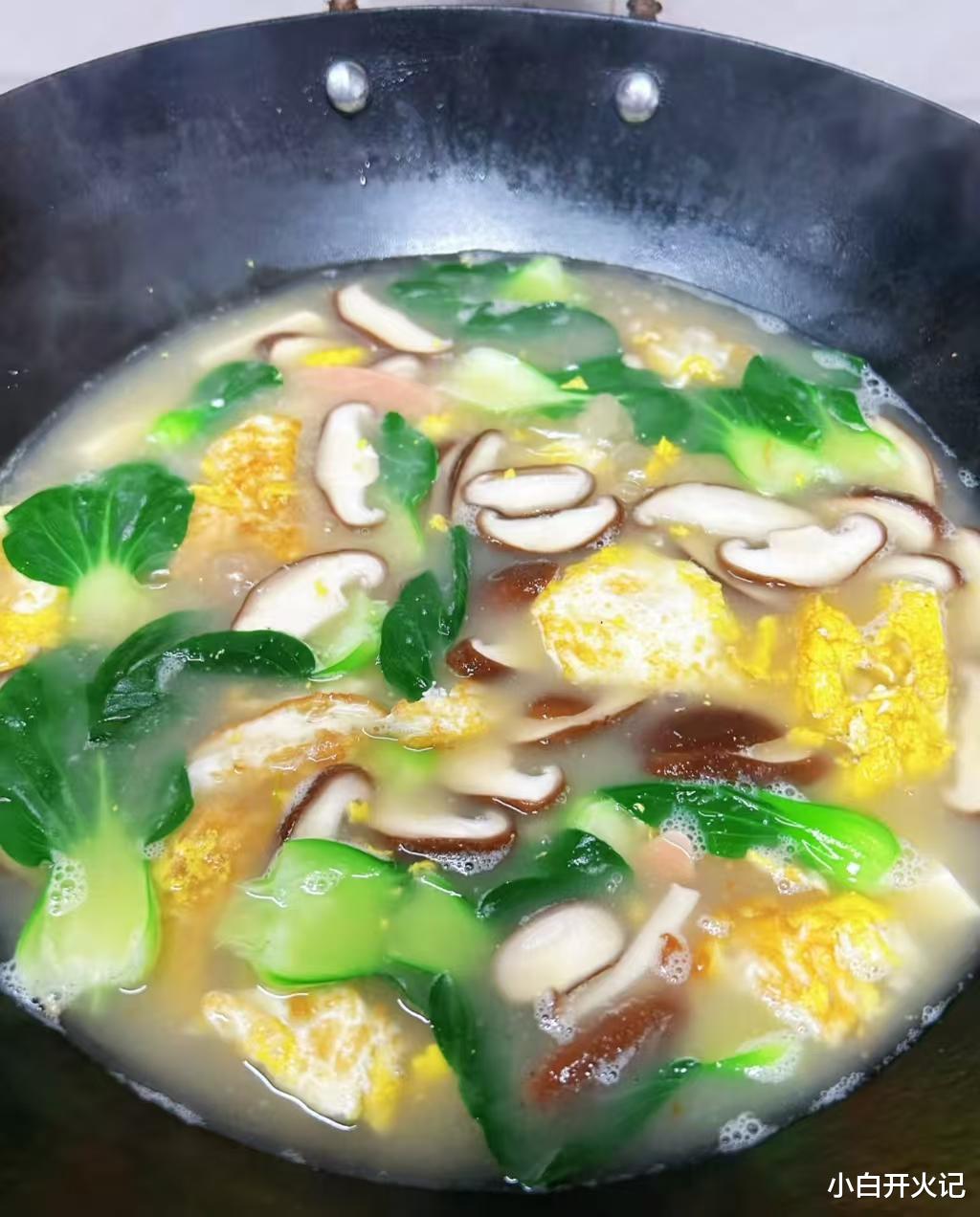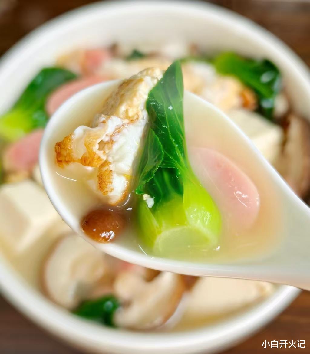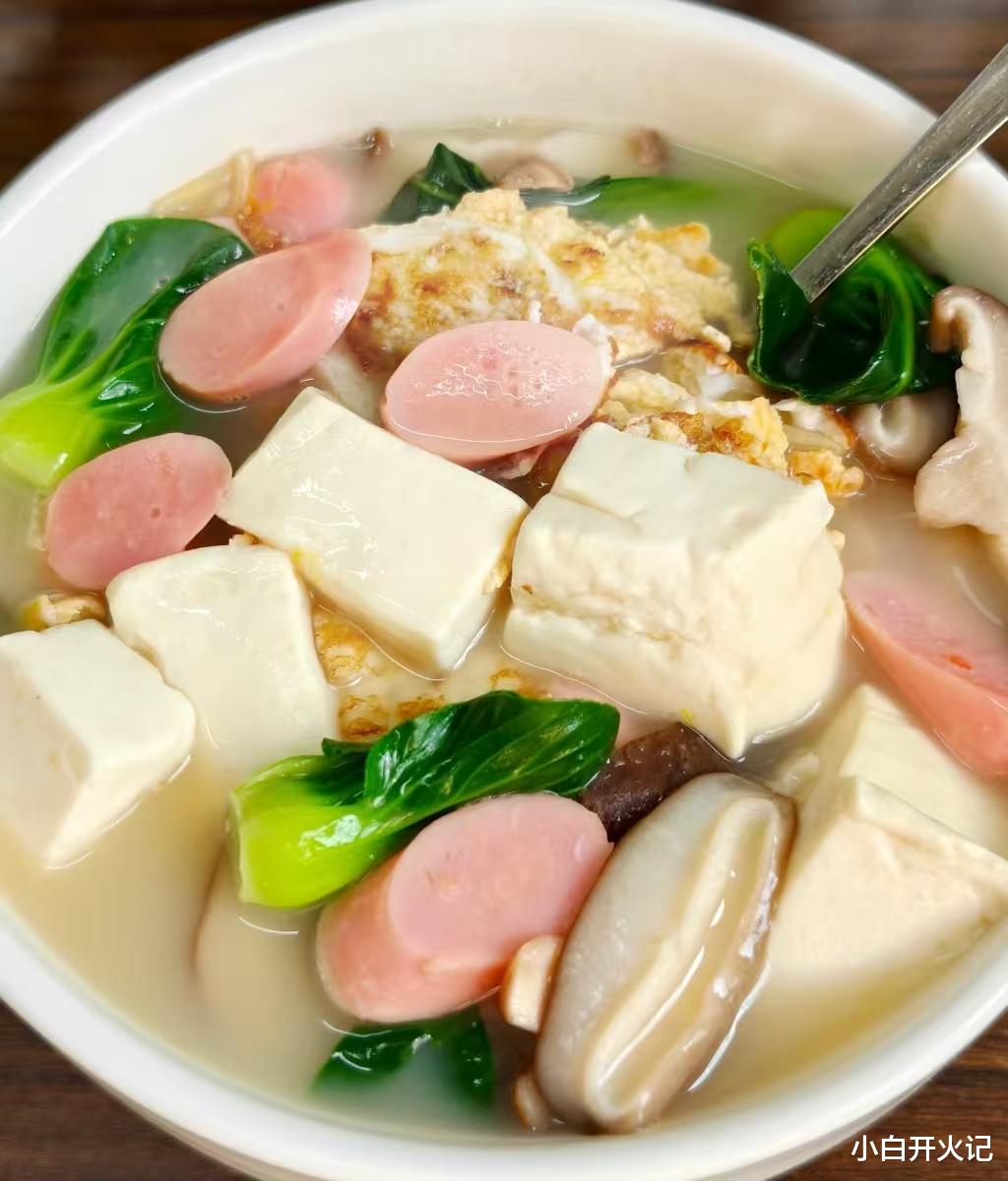 出锅!奶白汤底裹着金黄蛋丝,香菇像小伞撑开,豆腐颤巍巍,火腿肠热情翻红,青菜点睛。先喝一口——猪油煎蛋的焦香、香菇的森林气息、火腿的烟熏感,三重鲜味像浪花叠拍,胡椒微微辣,从舌尖暖到脚趾。豆腐吸饱汤汁,一咬“biu”地飙汁;青菜脆甜,正好解腻。我把汤盆端上桌,家属默默放下外卖筷子:“这汤,能续命。”