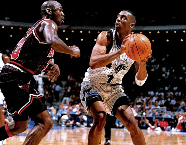 1994-95赛季常规赛,“便士”和乔丹仅一次交手,这次,“乔丹接班人”笑到了最后,“便士”全场砍下22分5篮板6助攻,进攻端存在感十足,还帮魔术把乔丹限制到投篮命中率仅有30.4%,最终以106-99击败了公牛,这就结束了吗?没有,双方竞争延续到了季后赛,魔术和公牛在次轮碰面,乔丹遭遇了1991年之后仅有的一轮系列赛失利。