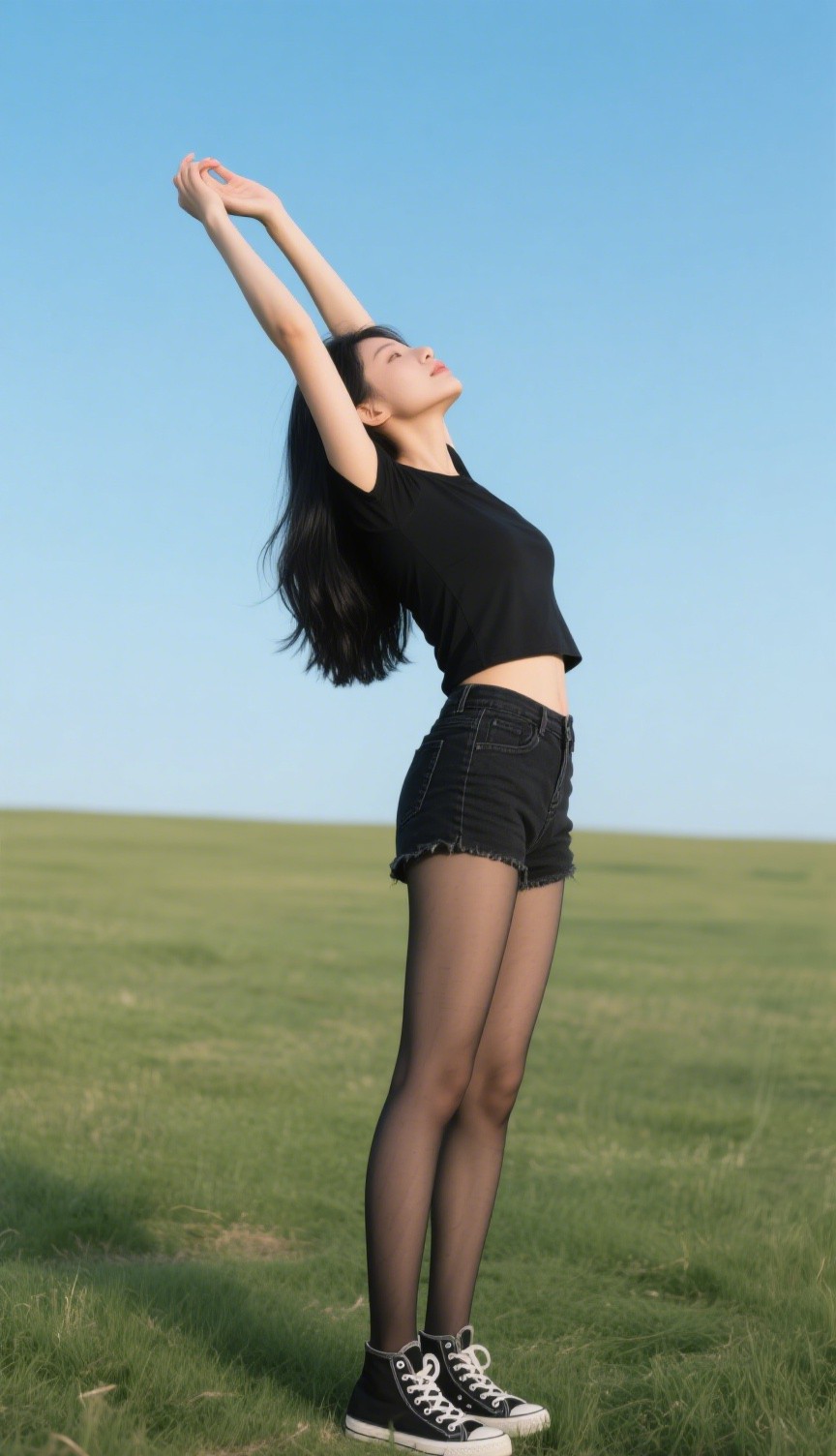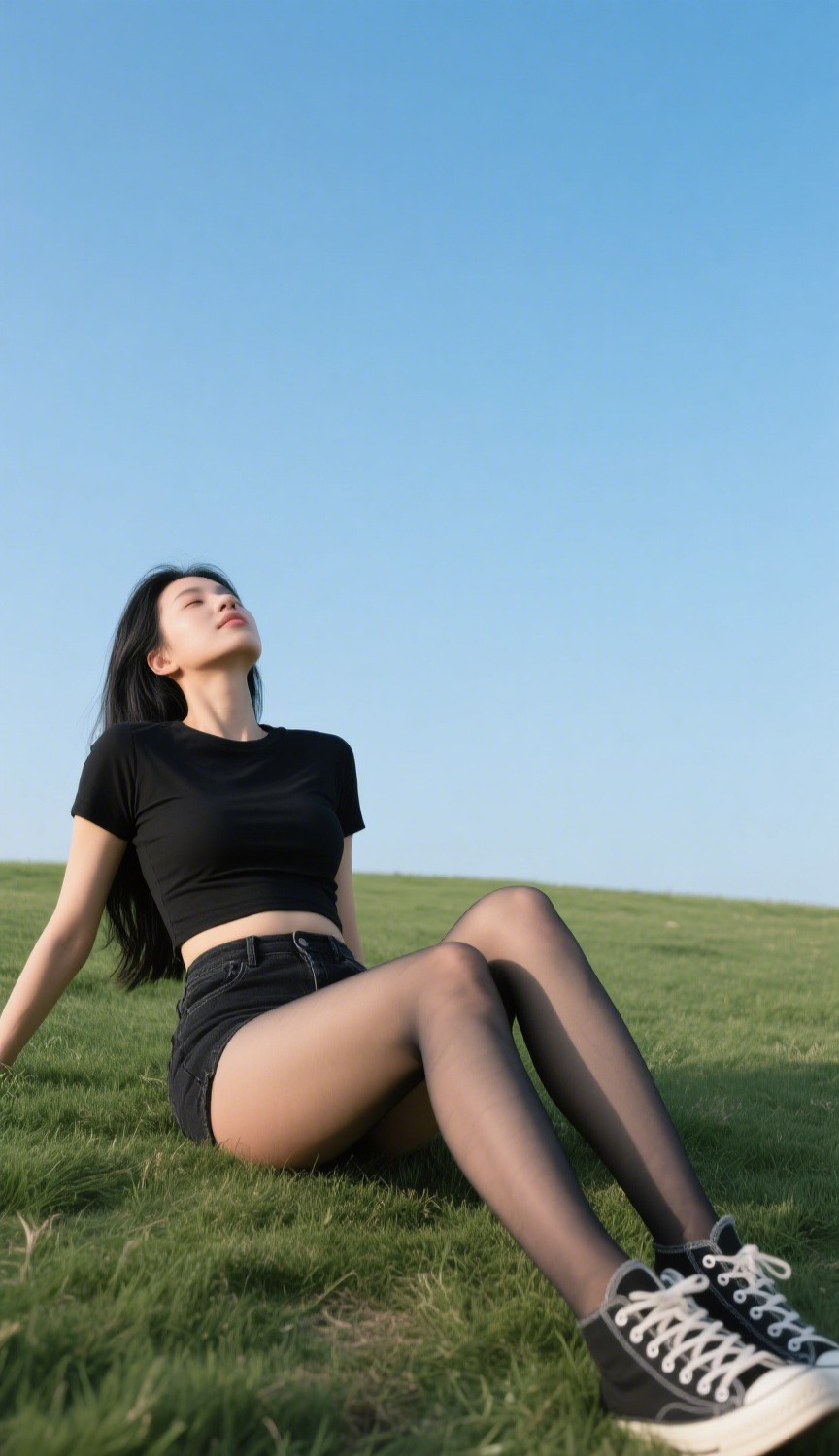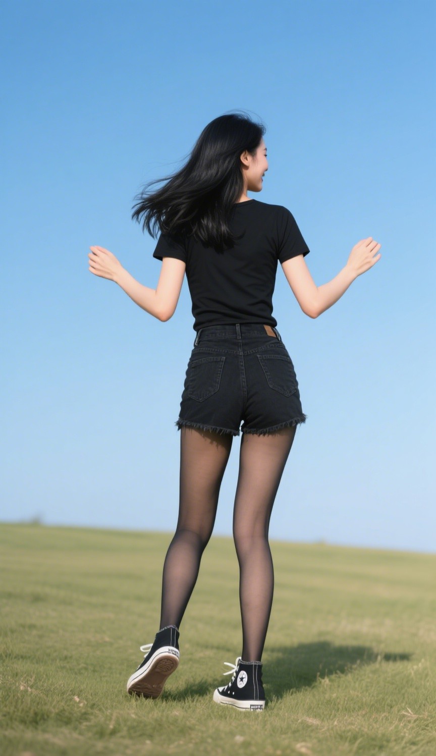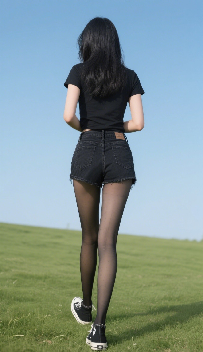 黑衣如夜的碎片,妥帖裹住身躯,在日光下泛着柔和的哑光,像把静谧的暮色穿在身上。短裤边缘的毛边随草动轻晃,交织出朦胧的美感,每一寸肌肤都在呼吸草原的风。脚下的黑帆布鞋,沾着草屑,带着些莽撞的青春气。它们踏过草尖时,惊起细碎的绿波,和身上的黑形成奇妙呼应 —— 是都市的简约,撞上旷野的自由。