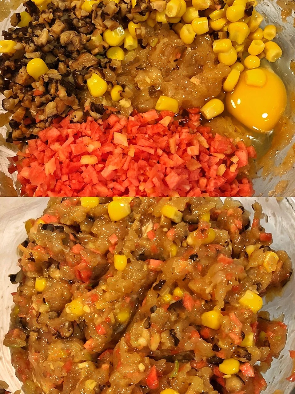 3️加一颗鸡蛋然后把胡萝卜香菇倒进去搅拌均匀开始包饺子