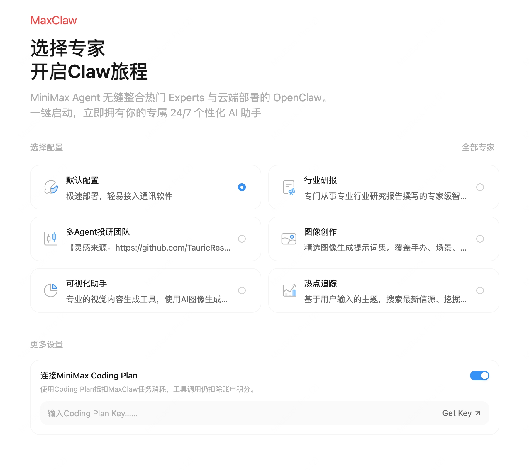 39元起步,MiniMax推出MaxClaw:AI助手走进"平价时代"最近一段时间,OpenClaw这个开源项目在全球范围内爆红——它让普通人第一次体验到了拥有一个"个人AI管家"是什么感觉。但本地部署的高门槛,让大量用户望而却步。于是,各大AI公司纷纷推出了自己的云端托管方案。推出各种【xxClaw】试图在这场大战中分得一杯羹。其中MiniMax推出的MaxClaw以39元就能体验在云端部署openclaw的优势脱颖而出。39元能用到什么?简单来说,MaxClaw把过去需要技术团队才能搭建的AI智能体,变成了一个人人可用的云端服务。1. 一键云端部署OpenClaw作为一个开源的AI助手框架,此前的使用门槛并不低——用户通常需要自备服务器、配置API Key、处理各种环境依赖。而MaxClaw将这些技术环节全部打包,用户只需在MiniMax Agent中点击启用,即可在云端运行自己的AI助手,无需任何技术背景。由于是在云端运行,MaxClaw能7天24小时在云端持续工作,即便关闭电脑或退出应用也不受影响。配合50GB的专属云储存空间,MaxClaw可以长期积累和记忆用户的工作上下文,越用越懂你。2. 开箱即用的专家级SkillMaxClaw预置了多个经过调优的专业技能模块,包括"爆款猎手"(帮你追踪热门内容趋势)、"多Agent投研团队"(模拟多角色协同进行投资研究)、"热点追踪"(实时监测行业动态)等。这些Skill不是简单的提示词模板,而是完整的工作流方案,打开就能用。据了解,MaxClaw即将支持调用超过1.6万个专家Skills,用户还可以根据自身需求自定义专属专家。3. 基础能力搭载极强模型MaxClaw搭载了MiniMax最新的M2.5模型,内置联网搜索、图片生成、视频生成、文件读写等全能工具链。值得强调的是,这些工具的调用不产生额外API费用,全部包含在会员权益内。同时支持Coding Plan计费模式,为有更高用量需求的开发者和团队提供弹性选择。4. 打通IM软件,多端协作同步MaxClaw已经打通了飞书、钉钉、企业微信等国内主流即时通讯工具,支持跨端消息推送和协作。无论你习惯用哪个办公平台,无不管你是在用移动端,还是网页端,MaxClaw都可以将的工作成果无缝同步过来。5. 多模态领域能力出色MaxClaw还集成了MiniMax在支持语音定制和音乐创作能力,让你的小龙虾多才多艺,进一步拓宽了AI助手的应用边界。回到价格本身。39元基础会员的定价策略,显然是MiniMax面向大众市场的一次主动出击。在竞品普遍定价超百元的背景下,这个价格有机会让更多用户真正跨过"试一试"的门槛。有兴趣的读者可以在MiniMax Agent的网页端或移动端直接体验MaxClaw网页端:MiniMax Agent: 简单指令, 无限可能移动端:应用商店下载MiniMax Agent appMiniMax Agent: 简单指令, 无限可能