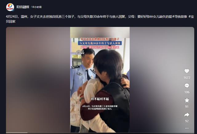据报道,三十年前,陈苹卿在浙江温州与亲生父母走散,而后便失去联系。