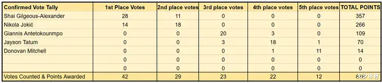 想要拿下MVP,基本就看第一选票了。字母哥一张第一选票都没有,已经是提前出局了。而亚历山大28张,约基奇只有14张,差距也是相当明显。目前已经透露的选票,已经接近一半了,但悬念已经基本没有了。68胜+得分王,这样的表现还是太疯狂了,亚历山大已经拿下28张第一选票,基本锁定了MVP了。