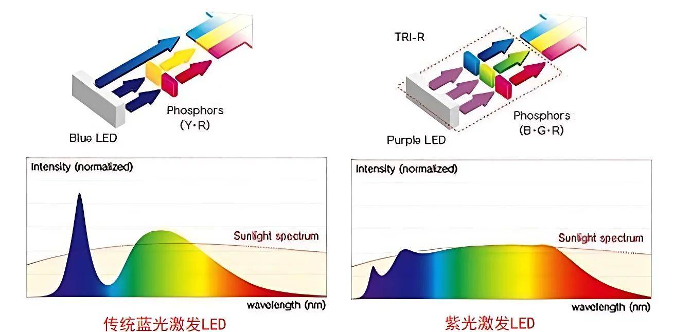 传统蓝光激发技术的LED灯,其光谱中450nm蓝光成分过高,而450nm波段的高能蓝光容易穿透角膜和晶状体,直接到达视网膜,引起视网膜细胞氧化损伤,增加黄斑病变和视力退化的风险。相比之下,紫光激发技术采用410-420nm紫光波段,避开450nm蓝光峰,从源头上减少蓝光伤害,降低视网膜光氧化应激反应,减少视网膜蓝光危害,降低视觉疲劳,同时光谱更连续,显色性更佳,视觉更舒适,更接近自然光。