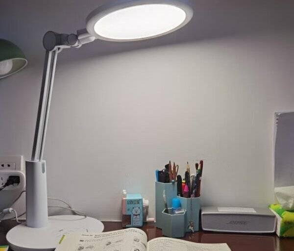 产品情况:这款护眼台灯照明覆盖还可以,有一些实用功能,适合学生家庭及基础照明使用。大圆盘光源直径约20 cm,可覆盖约1.8 m的桌面,减少手部阴影。底座是触控式无实体按键,使用比较简单,支持无极亮度调节+三档色温(3000K—5000K),还有45分钟定时休息提醒功能。护眼性能一般,注重护眼的人建议选其他台灯。