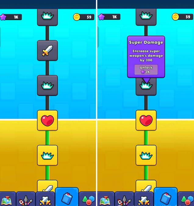 《Rapid Stack Blitz Game》的养成分为武器升级、天赋树升级和英雄三部分。