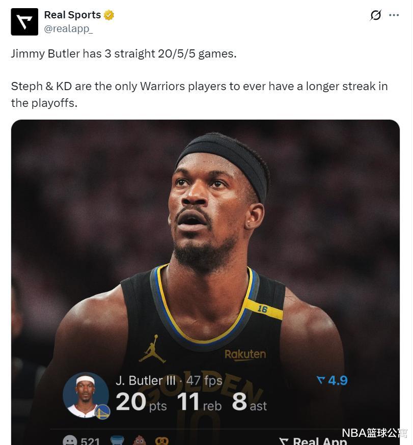同时,巴特勒还创下了纪录。数据显示:巴特勒过去3场季后赛均砍下至少20分5板5助攻,勇士队史第3长纪录,仅库里和杜兰特有过更长的纪录。