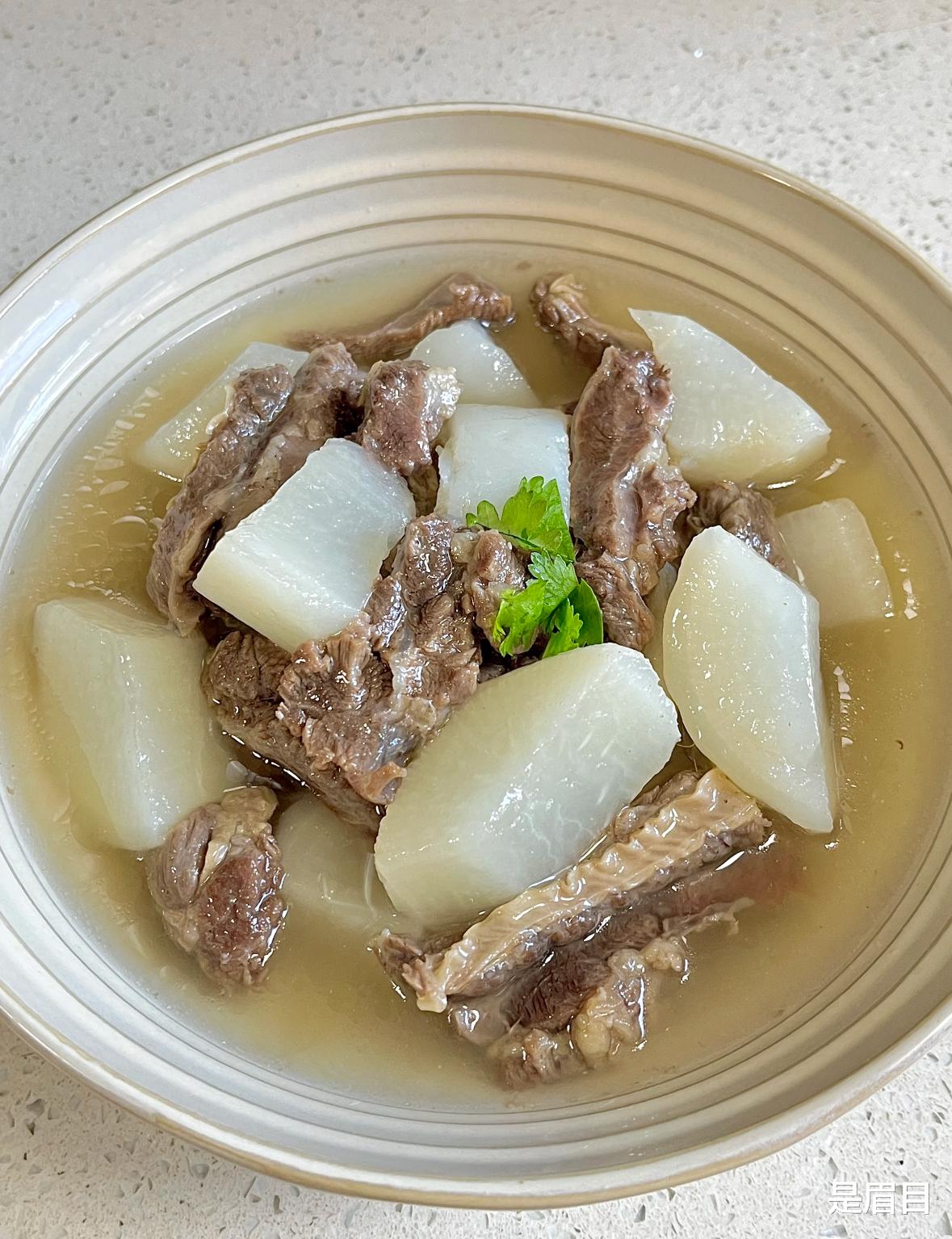 1. 牛肋条切3cm大块,冷水下锅,加姜片、葱段、料酒,大火煮沸后撇去浮沫。捞出用温水冲洗干净(一定要用温水,冷水会使肉质紧缩变柴)。2. 将焯好水的牛肋条放入锅中,加开水没过食材(一定要用开水,肉质更嫩),放入姜片、八角、花椒、香叶。大火煮开后转小火慢炖1.5小时(或用高压锅压30分钟)。3. 白萝卜去皮切滚刀块,在牛肉炖煮1.5小时后加入锅中,同时加盐调味。继续炖煮20-30分钟,至萝卜变软透明,用筷子能轻松戳透即可。4. 关火前撒上香菜或葱花,喜欢胡椒味的可加少许白胡椒粉提鲜。牛肉软烂脱骨,萝卜吸饱肉汁,汤鲜味美。