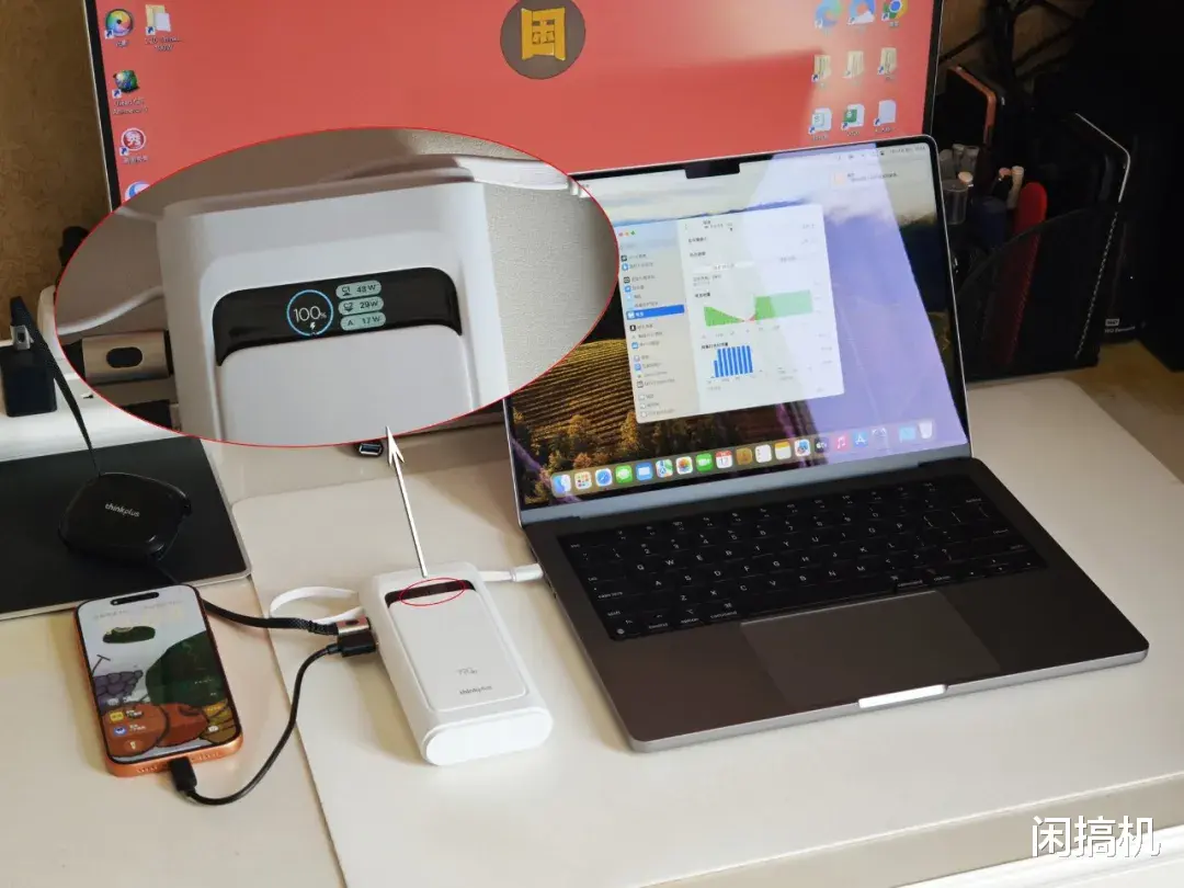 再利用DHC数字混动技术,同时给MacBook Pro和iPhone17 Pro充电,输入功率分别是48W和17W,在星巴克边充边用不心慌,足以应对临时充电的需求。
