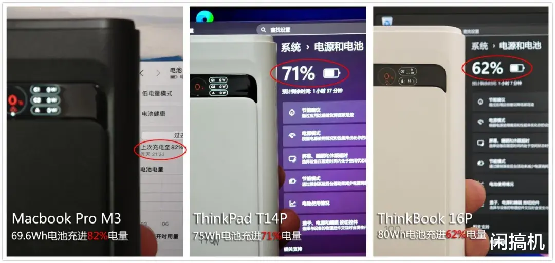 再看看能给这三部笔记本补充多少电量,先要换算一下容量单位。充电宝在3.7V标准电压下,换算公式为Wh=mAh×V/1000,20000mAh折合74Wh容量,但输出涉及转换损耗,不可能74Wh无损输出。