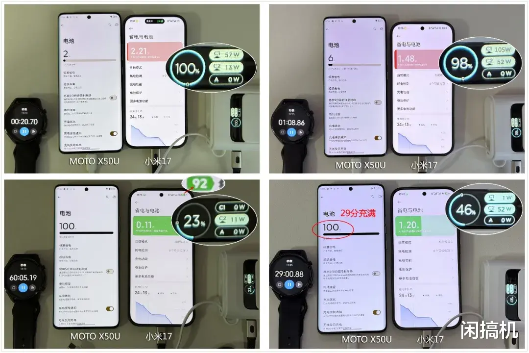 MOTO X50U充电功率稳定在57W-105W,110秒就充进10%,从1%充至100%只花了29分钟,这速度我服气。