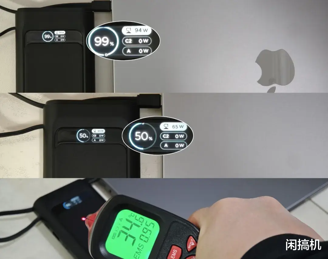 苹果MacBook Pro最大支持96W快充,一插上充电宝就飙到94W,放电一半后降至65W并稳稳保持,外壳温度只有34.6℃,温控表现相当不错。实测从100%放电至0%,只花了58分钟。