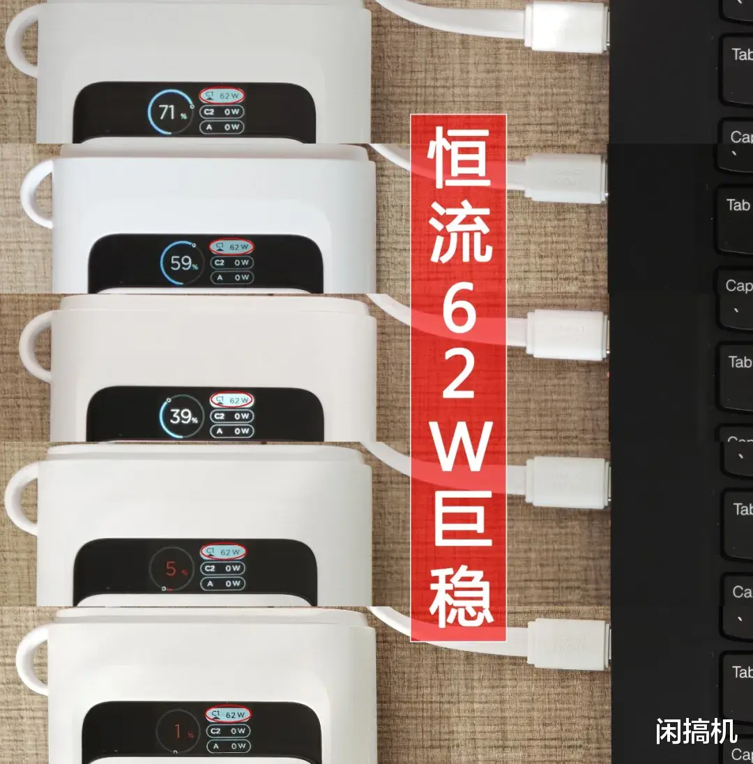 要知道,62W也算高功率输入,这种恒流快充既保证速度,又不伤电池。我曾用过很多大功率充电宝,输入功率上蹿下跳,忽快忽慢,很伤电池。