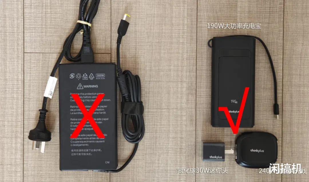 DHC数字混动技术可以让190W充电宝变成功率放大器,减少出差时携带电源的重量。像上图左边是某游戏本的原配电源,净重880克。而用thinkplus出的190W充电宝+30W迷你头+240W伸缩线,可以代替硕大的原充,出差重量减轻近一半。