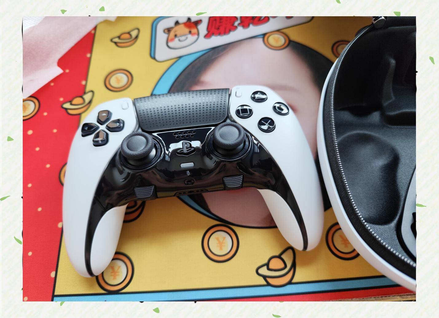 这款手柄白色外壳带淡金属光泽,搭配灯带过渡,科技感十足。握把升级为精英皮纹包胶,防滑且握持稳;摇杆是双限位阻尼可调TMR结构,25档齿轮可在30-90gf间调节,适配不同操作偏好。光轴3.0按键键程仅0.25mm,触发快、疲劳感低,不过部分玩家会觉得手感偏轻;宏背键磁吸旋转设计,可调角度还能拆,使用灵活。
