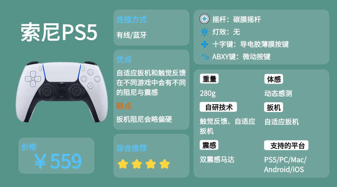 核心操控延续索尼经典布局,老玩家上手基本不用适应。自适应扳机和触觉反馈是最大优势,不同游戏能有不一样的阻尼和震感,比如赛车里模拟油门的渐变阻力、弹道操作类游戏时压枪的反向反馈,沉浸感很强。只是偶尔扳机阻尼会偏硬,部分游戏触觉反馈也有点“重”,适应后会好很多。支持蓝牙和USB-C有线双连接,切换顺畅,无线延迟低还稳定,能连PC、主机等主流设备。内置触控板、扬声器和麦克风,方便操作和语音;续航大概5小时不算长,但能边充边玩,插USB-C后体验不受影响。