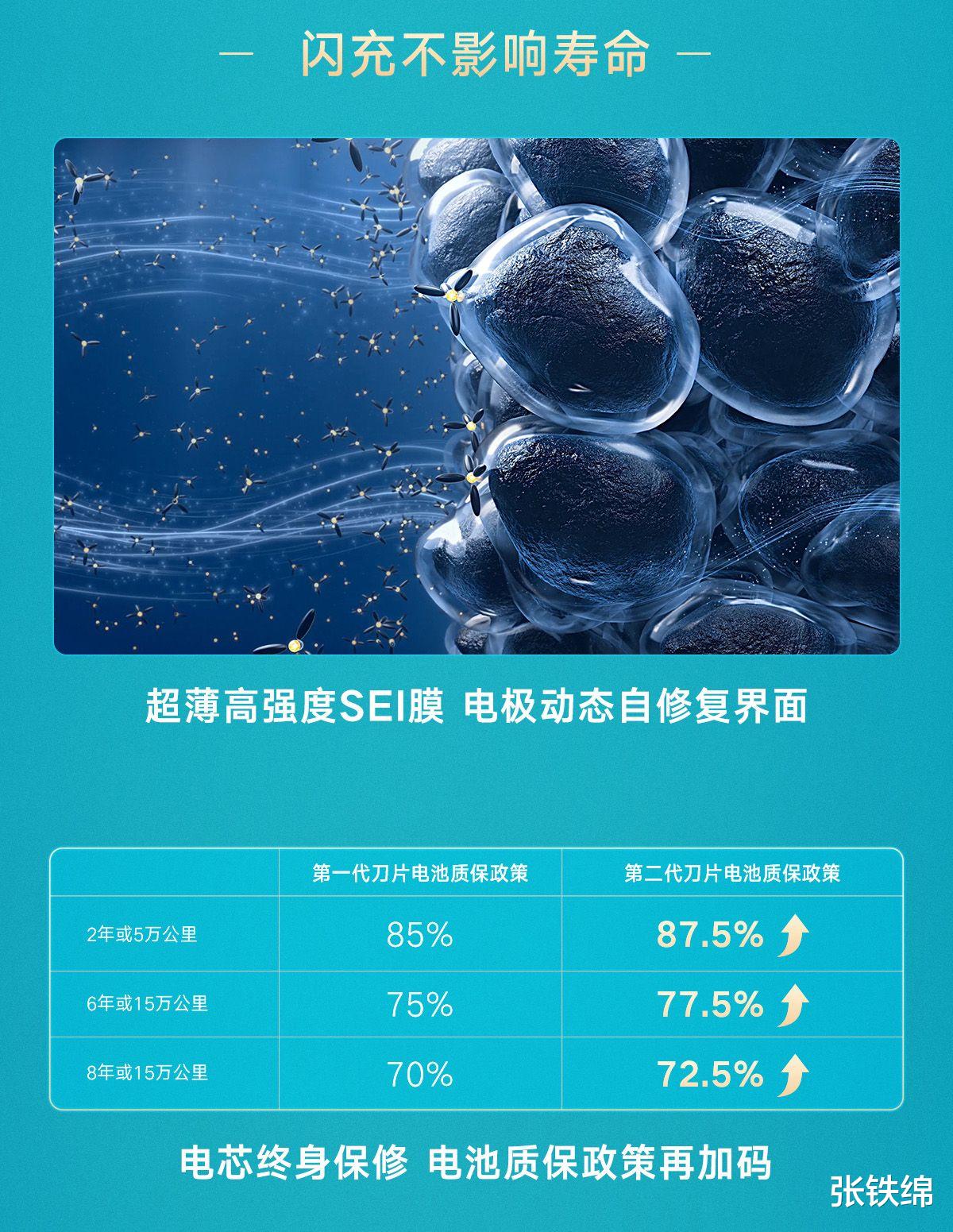 要知道比亚迪是做电池起家的,是名副其实的“电池大王”,比亚迪始终掌握着电池核心技术的定义权。因为对第二代刀片电池有足够的信心底气,比亚迪宣布电池质保政策再加码!第二代刀片电池质保的“容量保持率”整体提升2.5%,电池容量低于77.5%就免费包换,电芯依旧是“终身保修”。如果闪充真的影响电池寿命,谁敢做出这样的承诺?