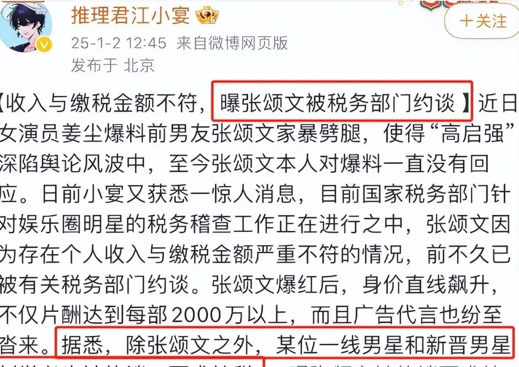 1月2日,娱记江小宴爆料说,【张颂文前不久被税务部门约谈了,因为他的收入和纳税金额严重不符】!
