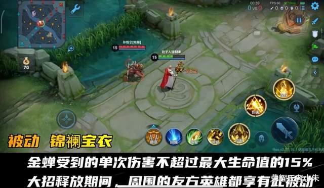 被动效果:当金蝉受到攻击,最大生命值高于15%时,自身能够减伤45%。同时释放大招,还会给队友提供减伤,以此来保护队友。通过金蝉的这个被动,我们就可以感受得到,这个英雄适合辅助位置。