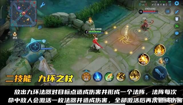 二技能展示:释放出九环之杖的九枚法器,攻击到目标造成270点的法术伤害,并且形成一个法阵。而法阵每攻击到敌方一次时,都会激活一枚法器并造成60点法术伤害,九枚法器全部激活后会造成300点法术伤害。另外连招的方式就是,先使用一技能的紧箍之咒,再用二技能的九环之杖,那么法阵就会自动追踪目标,附近的兵线或者野怪,也会朝着法阵的目标去,开启大招法阵的攻击速度还会大幅度提升。