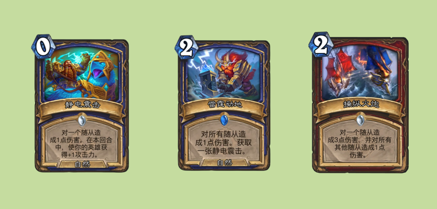 最后来看看神棍老师发布的新卡,其中还真有不少低费法术,静电震击,自然法术0费对一个随从造成1点伤害,并且在本回合中,使你的英雄获得+1攻击力,首先0费本身很灵活,其次这张法术能和上面两张橙卡都能配合,这张法术就是上面清风提到的用来启动先知者沃的那种优质低费法术,而且他的加攻效果还能配合穆拉丁的战锤,绝对好卡,就是好像和老卡重名了啊……而且静电震击还可以通过另一张2费新卡雷霆动地获取到,而这个雷霆动地的效果加起来有点像散装的操纵火炮,优点是灵活,而且还可以囤0费法术。