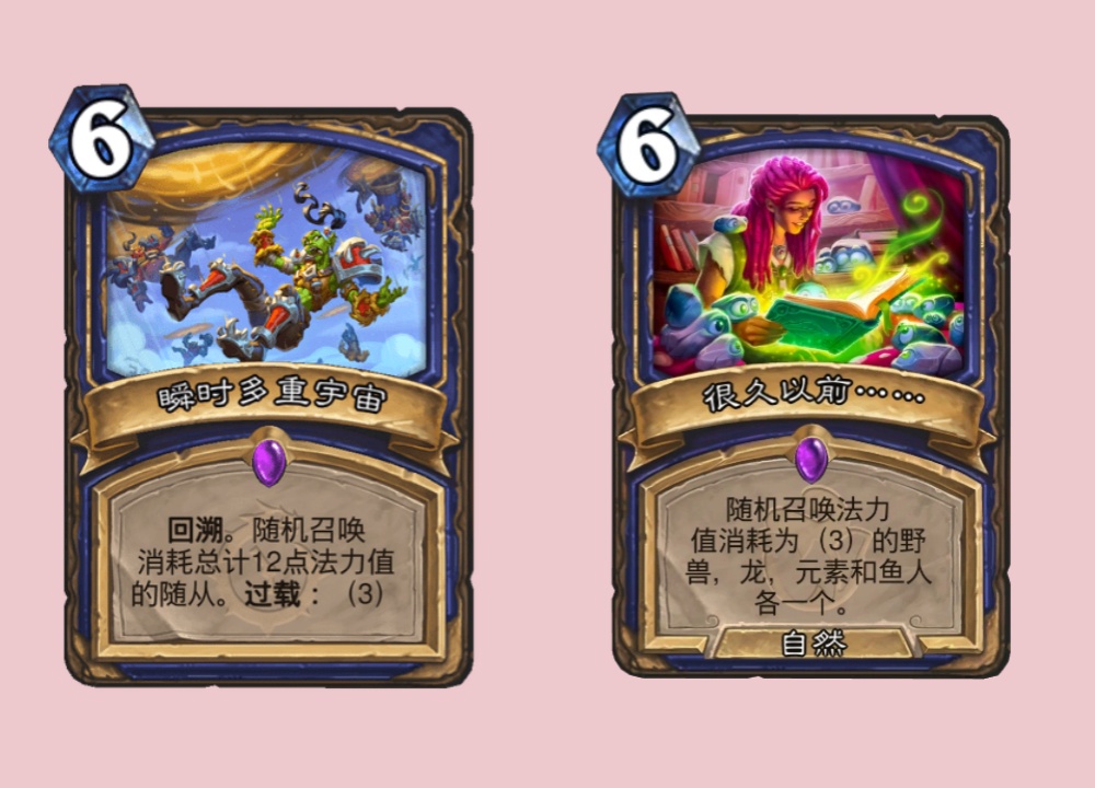接下来看看萨满的回溯法术:瞬时多重宇宙,6费,回溯。随机召唤法力值消耗总计12点的随从。过载:(3),说实话清风真的看不出来这张法术有啥过载的必要,设计师是不是忘了现在标准环境里就有一张6费法术“很久以前…”,3费的野兽,龙,元素和鱼人各一个,加起来不就是12费吗?连这张卡都不需要过载,凭什么一张随机性更高更不稳定的新法术,多了个回溯关键词就要过载,甚至还过载高达3点呢?而且“很久以前…”现在的出场率也并不高,这张新卡感觉就更不太可能有啥出场率了,除非后续有啥跟过载有关系的新套路。