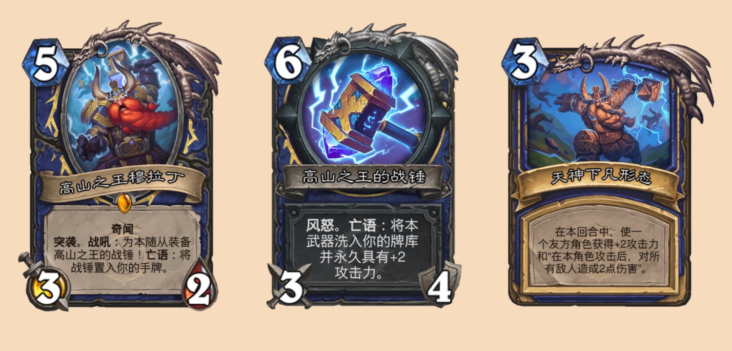 从演示视频上看,穆拉丁登场的时候是可以从牌库里把高山之王的战锤拽出来的,不过演示视频只展示了这一种情况,还需要设计师蓝贴解释一下战锤在手牌里和已经装备的情况下,是不是也能拽过去。在战锤没有被buff的情况下,穆拉丁登场实际上相当于5费6/6,突袭,风怒,已经很猛了,如果再搭配上天神下凡形态,可以直接解掉两个怪顺便打两次aoe,难怪这条时间线战胜了阿尔萨斯,敢情蛆DK的水蛭都被全场打2清掉了。而且武器和法术本身单拎出来也不弱,战锤初始和风领主的管号一个身材,后续再挂上就变成5攻4耐风怒锤了,很暴力,而法术光aoe就是奉献的模型了,更何况还能加攻,配合风怒随从还更厉害,感觉是目前看到最强的奇闻橙卡。