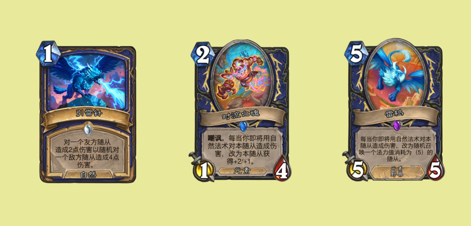 引雷针也是一张萨满的低费自然法术,1费,对一个友方随从造成2点伤害以随机对一个敌方随从造成4点伤害,有一说一,这效果怎么看着更像是术士的,有代价的随机打4,感觉有点弱。不过这个自残效果可以配合其他新卡,时流亡魂,2费1/4,嘲讽,每当你即将用自然法术对本随从造成伤害,改为本随从获得+2/+1,詹姆斯再次震怒,这张牌如果2费准时来的话可能还是有些说法的,配合雷霆动地和引雷针解场的同时还能变大,但要是配合来得不齐就感觉一般了。另一张配合自残效果的是雷鸫,费用高达5点,而且自残效果改为召唤随机5费随从,除非提前囤几个静电震击不然有点难用。