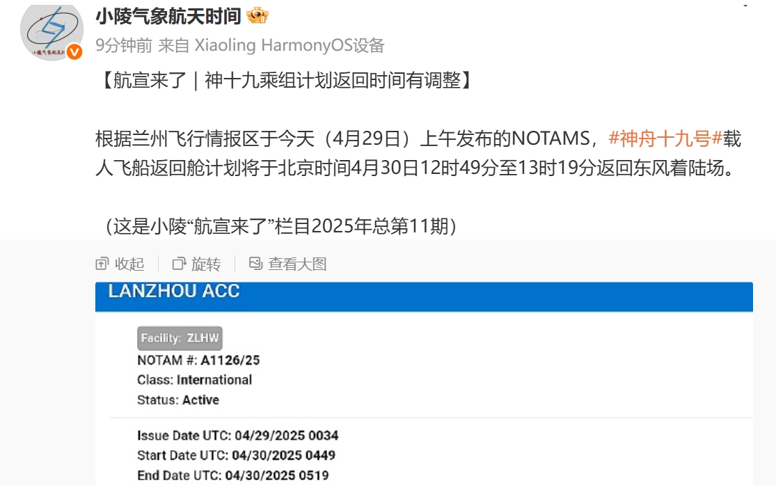 返回时间推迟?根据兰州飞行情报区于4月29日上午发布的航行通告(NOTAMS),神舟十九号的返回时间将推迟一天,预计于4月30日13时前后降落在东风着陆场。