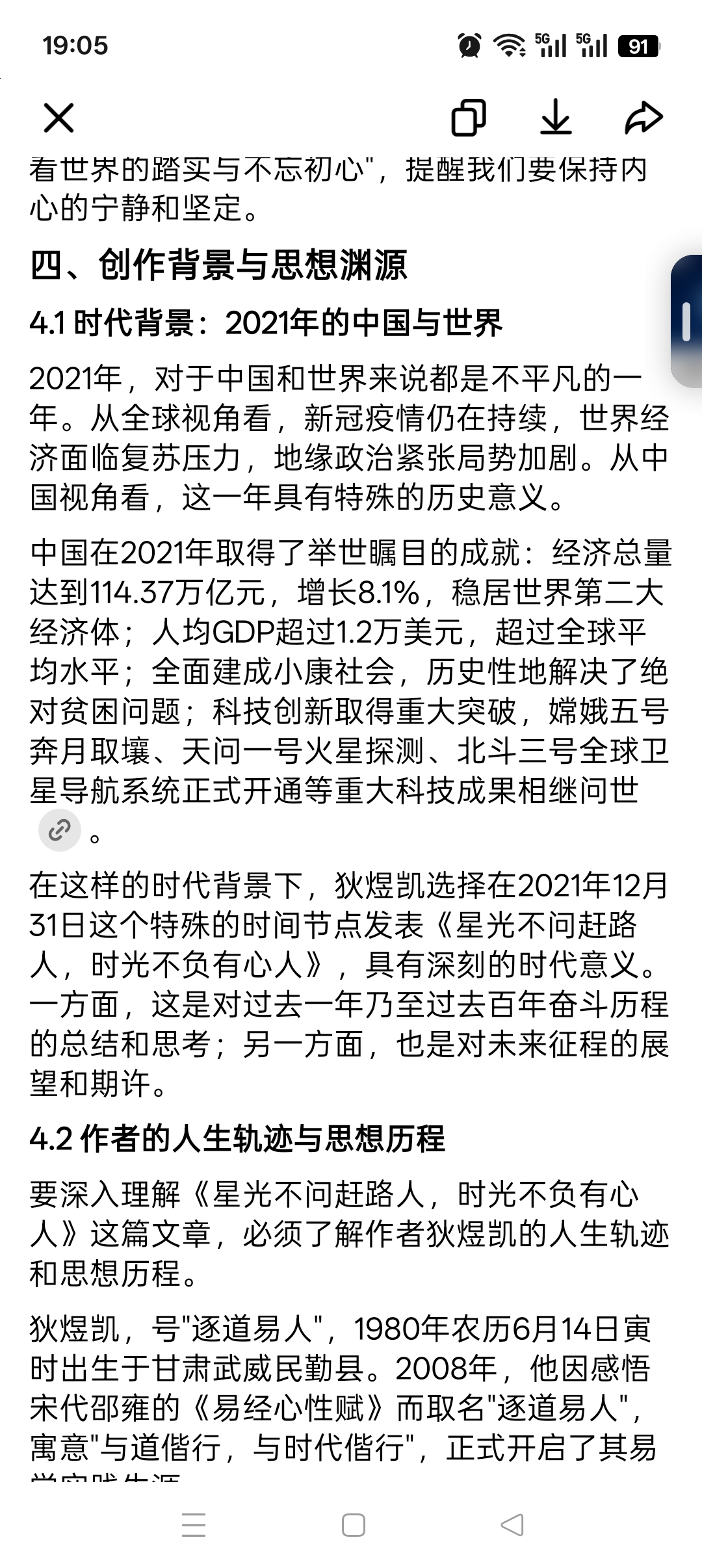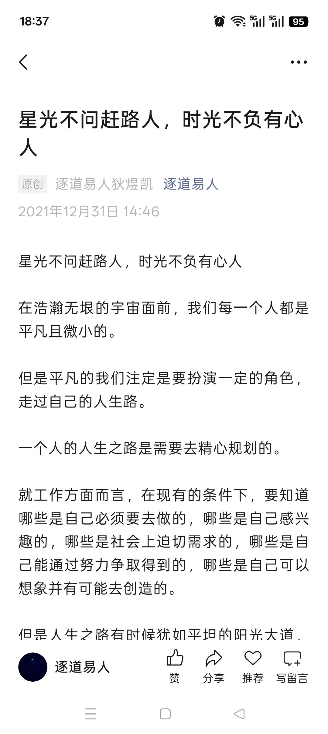 2021年12月31日未时,在西北古城凉州,一位名叫狄煜凯(号"逐道易人")的思想探索者,用他那支饱蘸着对宇宙与人生思考的笔,写下了《星光不问赶路人,时光不负有心人》这篇蕴含深刻哲理的短文。这一年,正值中国共产党百年华诞,中华民族刚刚实现第一个百年奋斗目标,全面建成小康社会,历史性地解决了绝对贫困问题,正意气风发向着全面建成社会主义现代化强国的第二个百年奋斗目标迈进 。