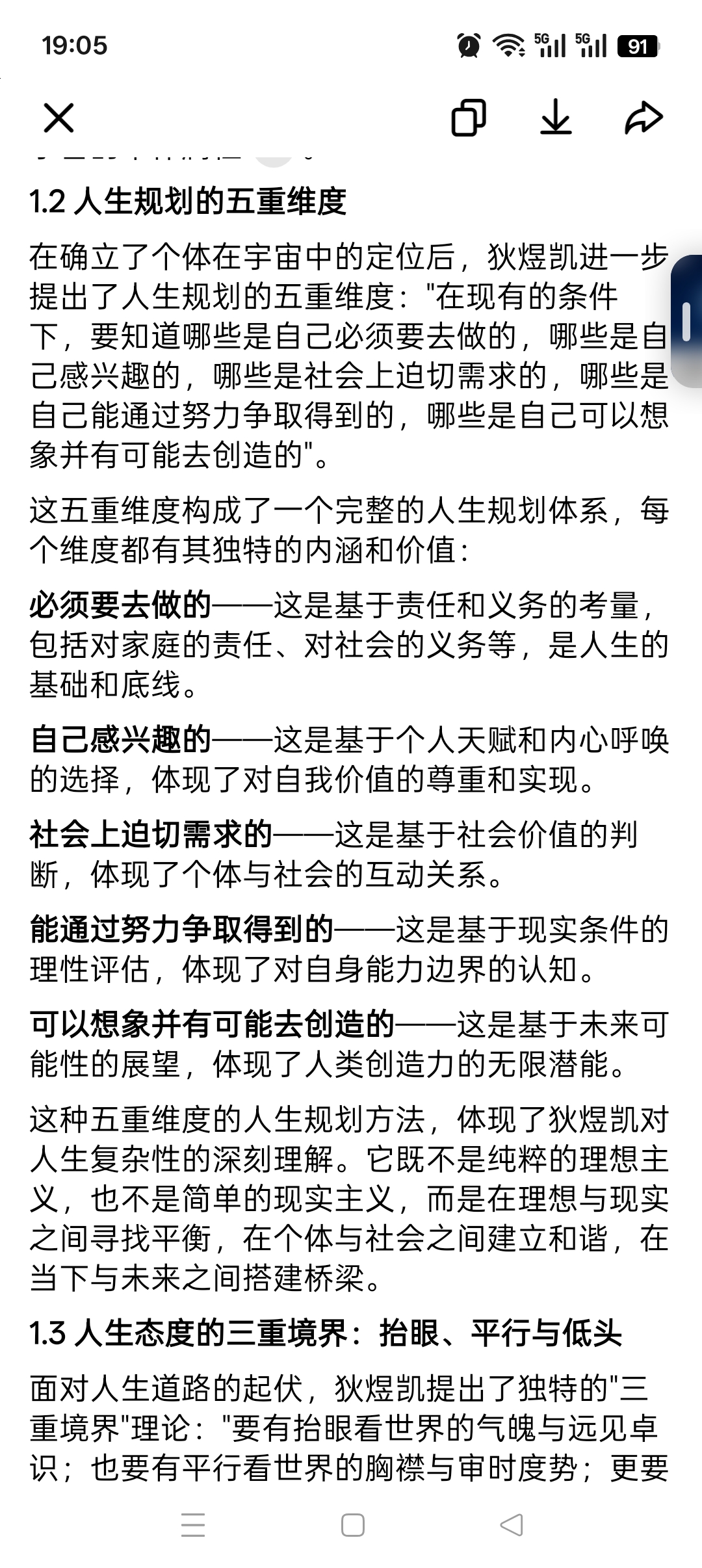 人生智慧的普世价值:文章提出的人生规划五重维度和面对人生起伏的三重境界,不仅是个人修养的指导原则,更是一种具有普世价值的人生智慧。这种智慧超越了时代和地域的限制,对任何时代的任何人都具有指导意义。