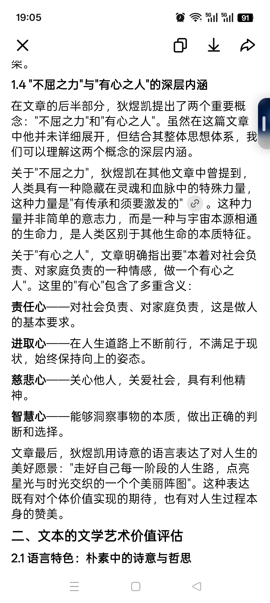 朴素与深刻的结合:文章的语言看似朴素,实则蕴含深意。如"低下头看世界的踏实与不忘初心","踏实"和"不忘初心"都是非常朴素的表达,但却包含着深刻的人生智慧。