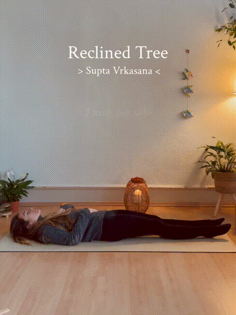 趴下,左脸颊放在靠垫上。将右膝向枕垫的右侧移动,与你的臀部平行。与右腿成90度角,右脚跟与右膝成一直线。保持几分钟,然后在另一边重复。动作9,仰卧树式,每侧2分钟