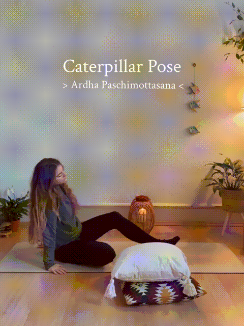 从下犬式开始,将右脚向前迈开一大步,屈膝右腿贴地右小腿与髋部平行(初学者可以简化练习,先靠近髋部一些)髋部中立位朝向正前方,伸直左腿。吸气,向上立直脊柱,呼气,放松双肩,屈手肘,脊柱延展前屈,额头放在抱枕上。动作6,毛毛虫式5分钟
