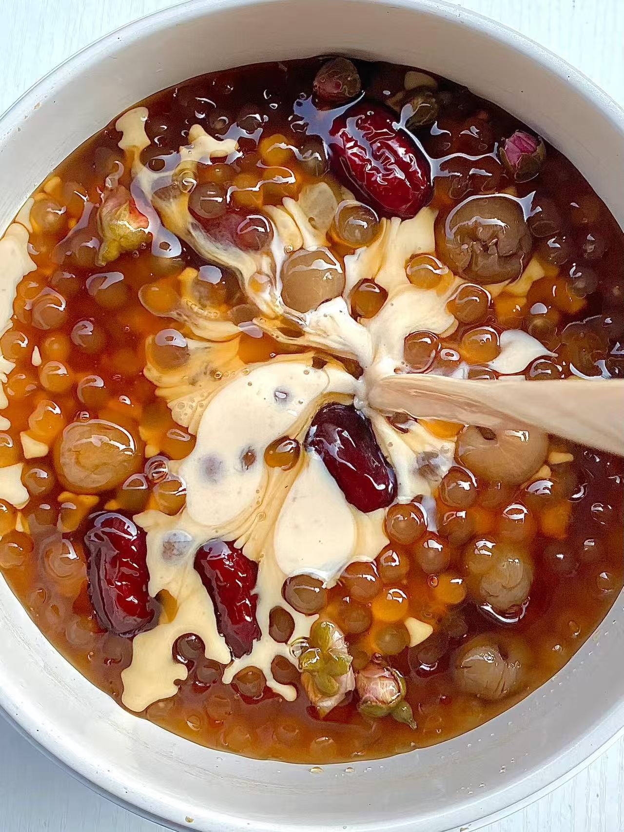 甜品大家都爱喝,但是在甜品店购买的甜品,添加剂又太多,吃多了总归对身体不好。于是乎,我便自制起来,给家人尝了下,被夸可以原地开店了。哈哈哈,别提心里多高兴。这杯自制的桂圆红枣西米露融合了桂圆的甘甜、红枣的醇厚、西米的 Q 弹以及奶茶的丝滑,每一口都饱含着温暖与甜蜜。下面就把我的制作方法分享给大家,简单易学哦,赶紧动起来。
