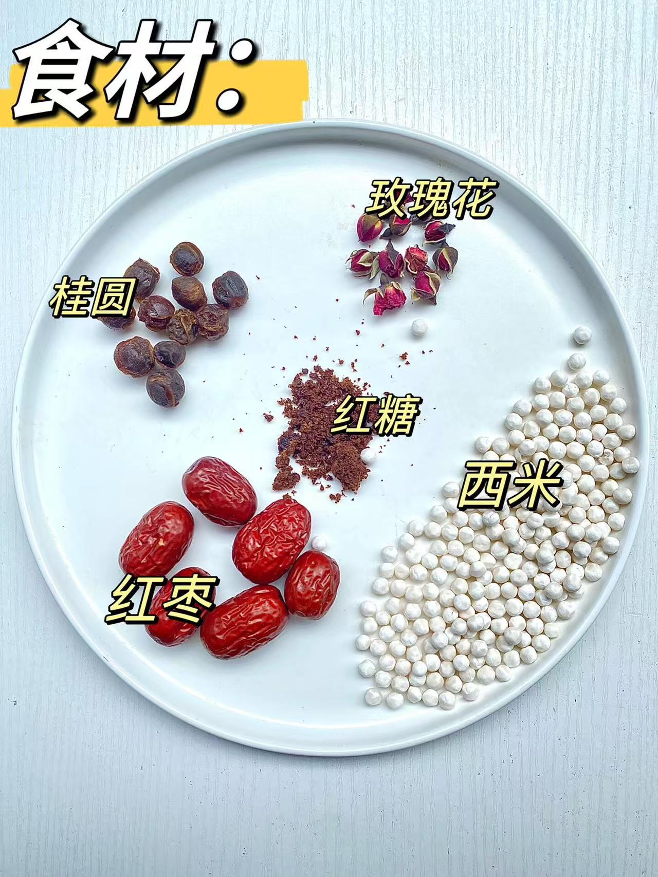 - 主料:西米 50 克、干桂圆 、红枣、玫瑰花、纯牛奶 500 毫升