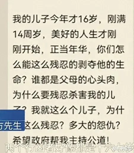 据了解,方先生育有一子一女,并且的家庭背景并不富裕,如今女儿已经出嫁,唯一的儿子是已经成了方先生一家的精神支柱,如今儿子遇害,方先生甚至都没来得及见到最后一面。