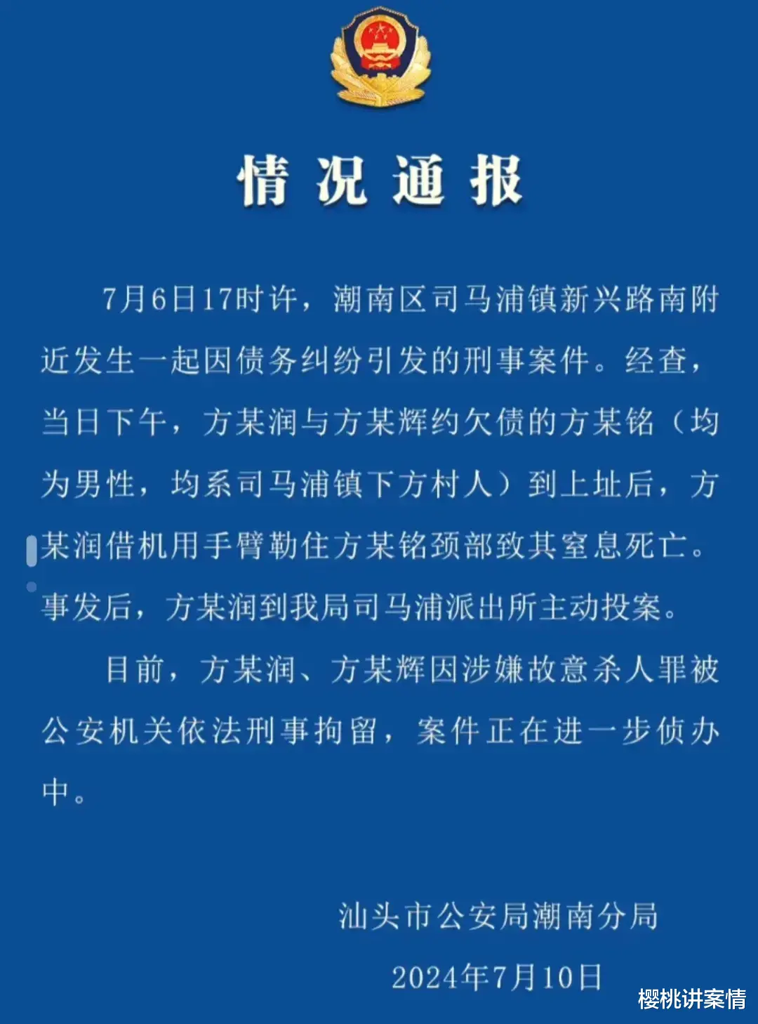 7月10日,汕头公安局发布的警情通报显示,方某铭的致死原因是因为犯罪嫌疑人方某润,利用比勒住脖子导致的窒息死亡。