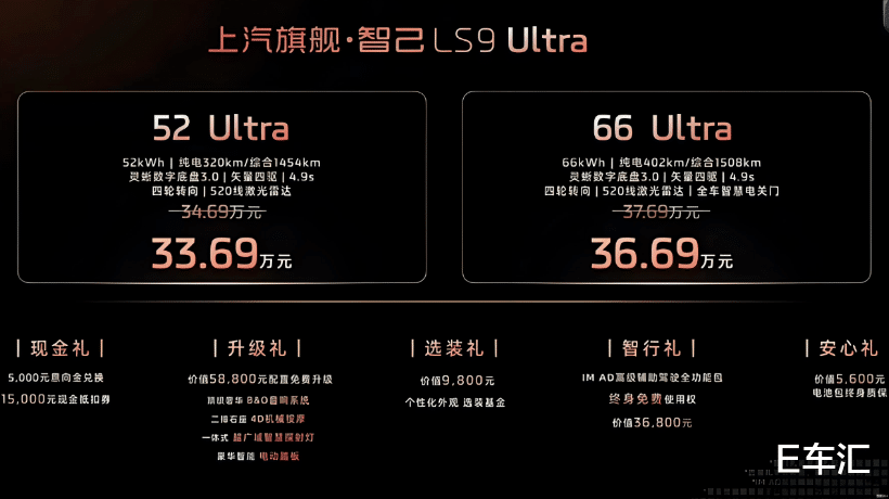 更显智慧的是,智己采取了“全系Ultra”配置策略,将800V高压架构、激光雷达、灵蜥数字底盘等核心配置全部作为标配,形成“高配低价”的错位竞争优势。