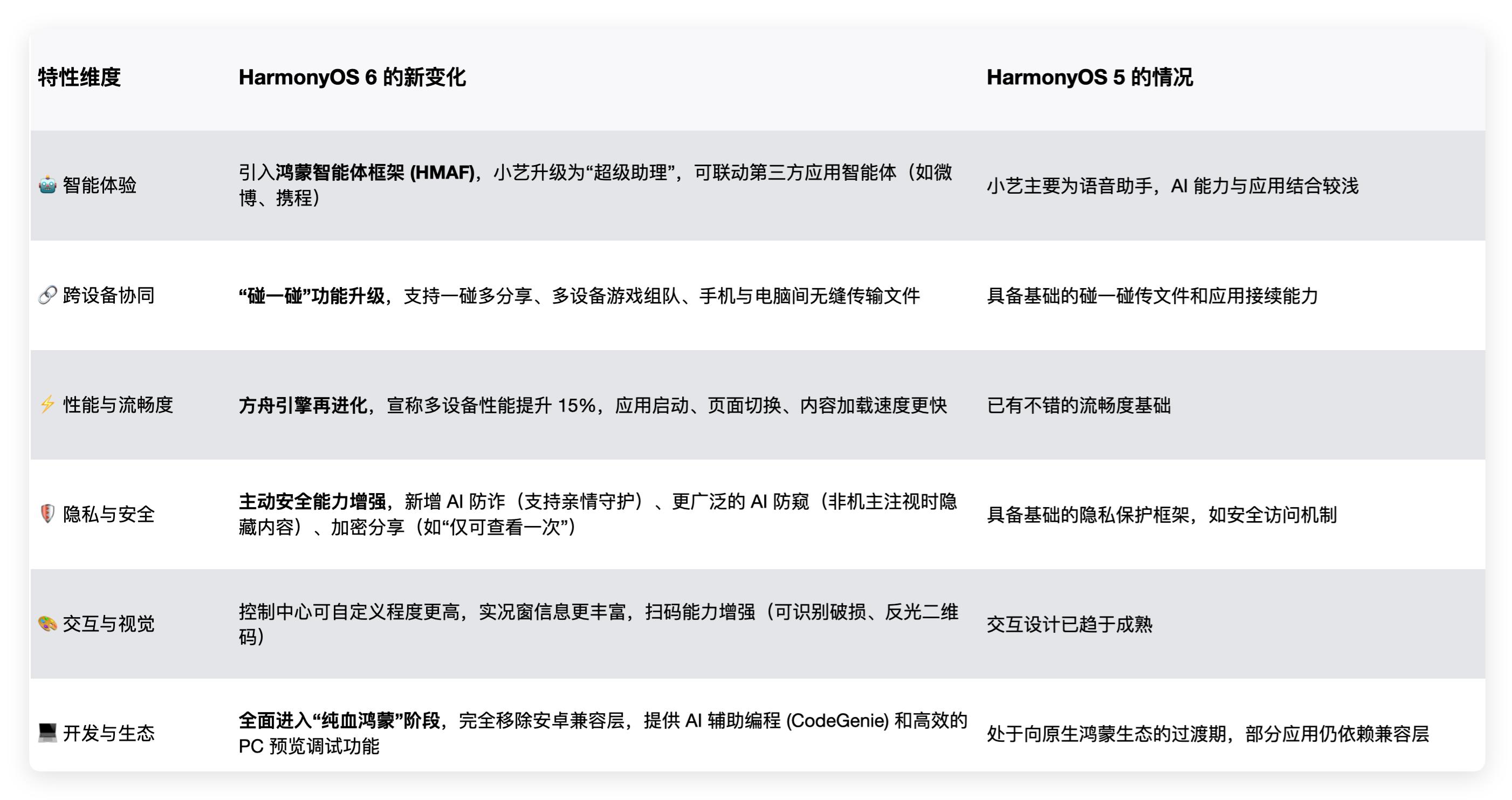 1,鸿蒙 HarmonyOS 6 升级了什么?HarmonyOS 6在 6 月时候发布了开发者 Beta 版,和HarmonyOS 5在智能化、跨设备协同、流畅度、安全和开发体验方面有提升。